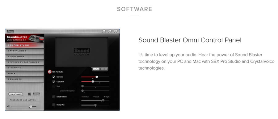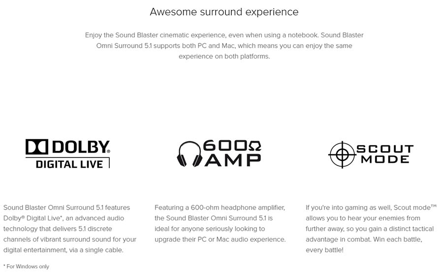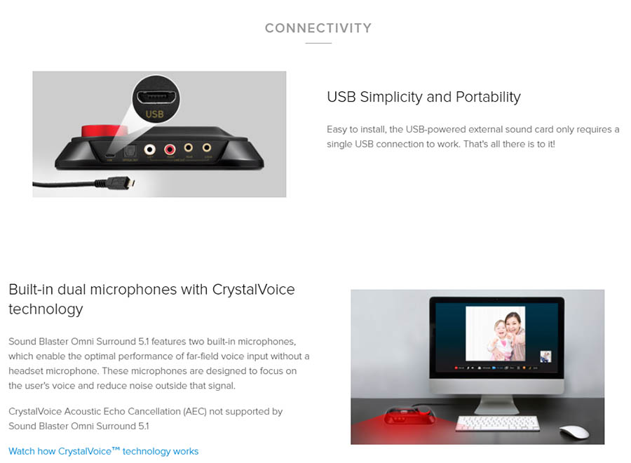 Sound Blaster Omni Surround 5.1 มอบความสมจริงราวกับนั่งรับฟังในโรงภาพยนต์บนเครื่อง PC หรือ MAC ผ่านการติดตั้งด้วยสาย USB เท่านั้น ขุมพลังขับเคลื่อนด้วยเทคโนโลยี SBX Pro Studio ด้วย External Soundcard นี้ จะสามารถเปลี่ยนพีซี หรือ แม็คอินทอช ให้กลายเป็นระบบเสียงในแบบ 5.1 ได้อย่างง่ายดาย พร้อมสัมผัสถึงเสียงที่น่าทึ่ง และยังสามารถทำการปรับแต่งเสียงเอฟเฟ็คต่างๆผ่านโปรแกรมควบคุม Sound Blaster Omni Control Panel มันเยี่ยมยอดเช่นกันสำหรับการใช้งานทางด้านการสนทนา เนื่องจากไมโครโฟนภายในที่ใช้เป็นแบบ dual array microphone ที่จะทำงานร่วมกันกับเทคโนโลยีเอกสิทธิ์ CrystalVoice ทั้งสองนี้จะช่วยให้คุณภาพของเสียงมีความกระจ่างชัดเจนมากๆ ไม่ว่าจะเป็นการสนทนาแชท หรือ การบันทึกเสียง และถ้าคุณเป็นผู้ที่นิยมการรับฟังเพลงที่คำนึงถึงคุณภาพเสียงต้องมาก่อน Sound Blaster Omni Surround 5.1 ขอมอบช่องเชื่อมต่อหูฟังกำลังขับสูง 600 โอมห์ ที่จะรับรองกำลังขับอย่างเต็มที่ ในระดับเดียวกับสตูดิโอมอนิเตอร์ริ่ง