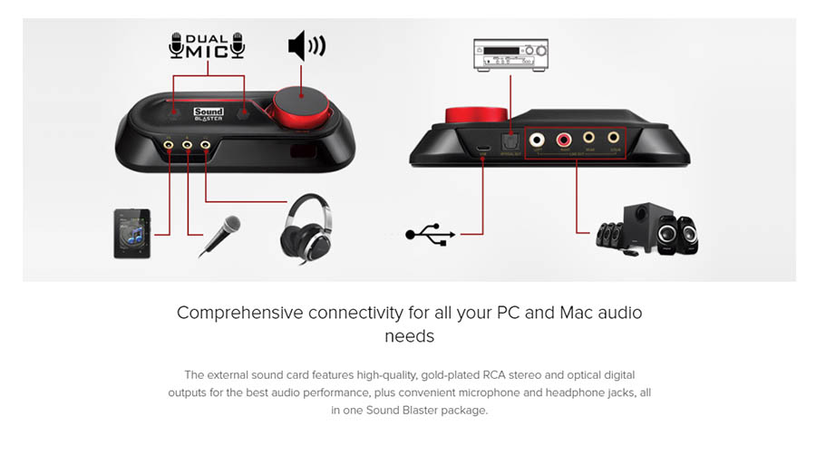 ซาวด์การ์ดแบบเชื่อมต่อภายนอกรุ่นนี้มาพร้อมกับวัสดุประกอบในระดับคุณภาพสูง ประกอบไปด้วยช่อง RCA สเตอริโอเคลือบทอง และ ช่อง optical เอาท์พุท เพื่อประสิทธิภาพเสียงที่ดีที่สุด และยังเพิ่มความสะดวกในการใช้งานร่วมกับไมโครโฟนด้วย ช่องเชื่อมต่อสำหรับไมโครโฟน และ หูฟังโดยเฉพาะ ทั้งหมดนี้มีอยู่ในชุดซาวด์การ์ดจาก Sound Blaster