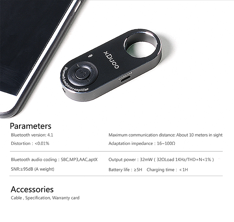 ตัวเครื่องมีขนาดเล็กเท่ากับ USB Disk ทั่วไป น้ำหนักเบา พกพาง่าย บอดี้ทำจากอลูมีเนียมฝังกระจกกันรอยอย่างดี มาพร้อมกับความสามารถมากมาย เช่น ใช้งานแบบ Bluetooth Dac สามารถเชื่อมต่อ 2 อุปกรณ์ได้พร้อมกันในเวลาเดียว และรองรับการใช้งานเป็น USB DAC กับคอมพิวเตอร์ รองรับการใช้งานกับมือถือทั้งในระบบ iOS และ Android สามารถใช้งานขณะชาร์จ Battery