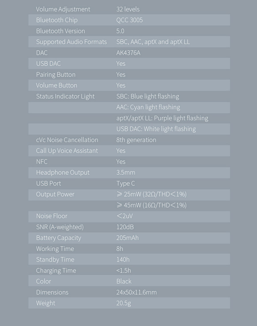 รองรับระบบ Bluetooth 5.0 และ AptX มีไมค์ ปุ่มเพิ่มลดเสียง และปุ่มรับสาย แบตเตอร์รี่สามารถใช้งานฟังเพลงต่อเนื่องได้ประมาณ 8ชั่วโมง ระยะเวลาใช้งานขึ้นอยู่กับการใช้ AAC codec