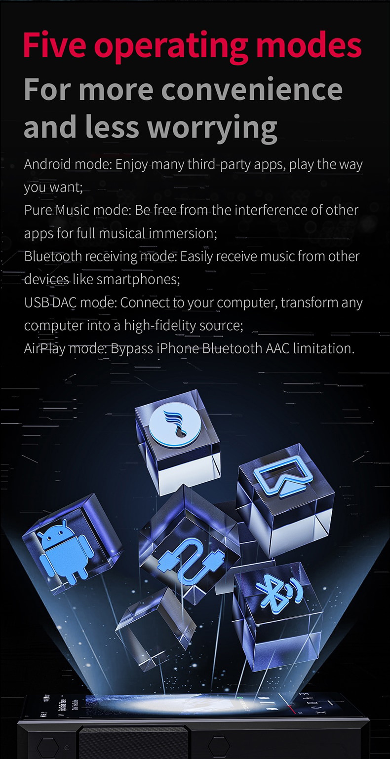 Androids / Pure Music / Bluetooth receiving / USB DAC / AirPlay