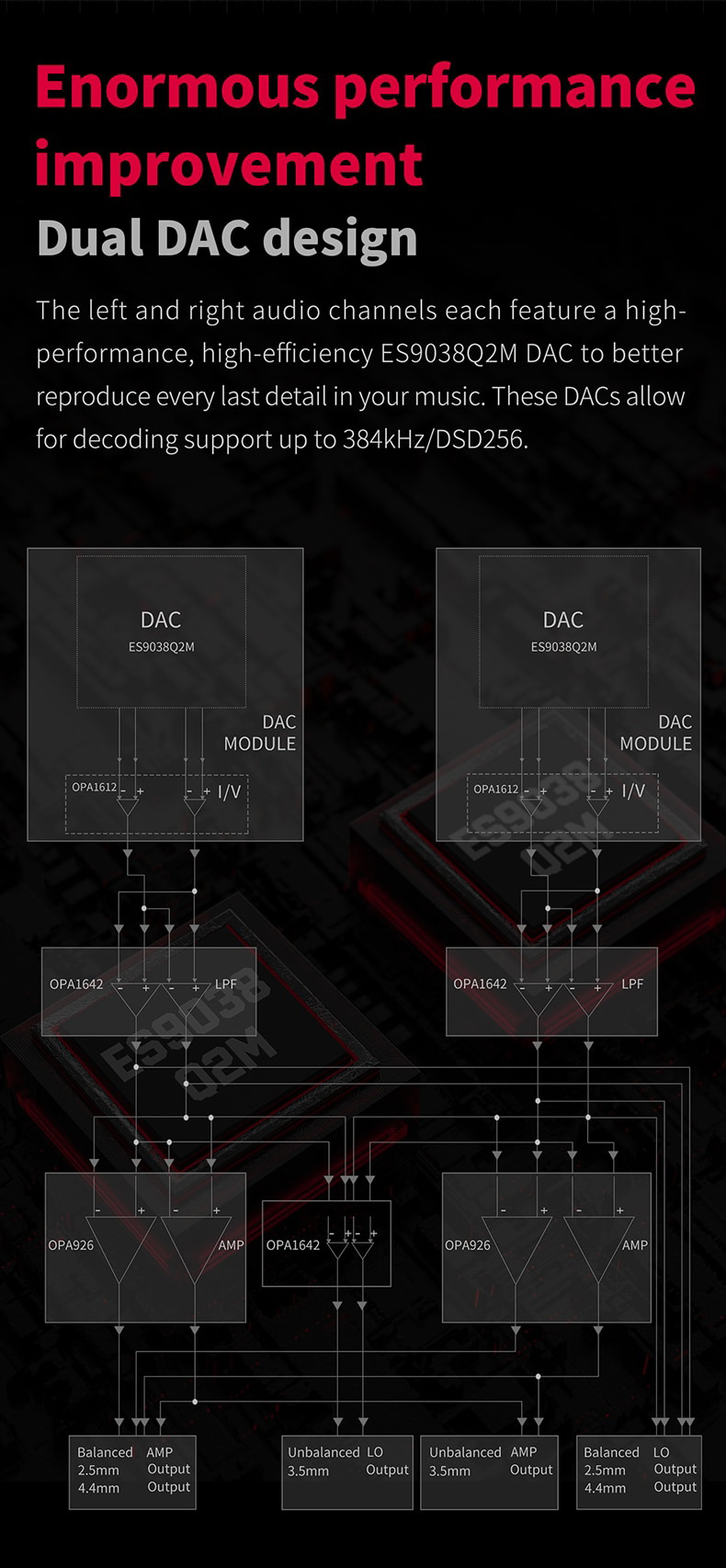 ชิป DAC คู่ ES9038Q2M ที่ได้รับการปรับปรุงประสิทธิภาพอย่างมาก รองรับการถอดรหัสสูงสุดถึง PCM 384kHz/DSD256