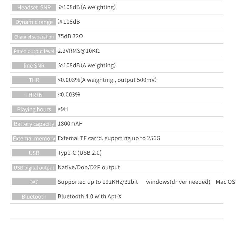 รองรับไฟล์ lossless หลากหลาย DSD256 และ PCM รองรับสูงสุดถึง 384 khz/32bit และรองรับไฟล์ WAV , FLAC , APE , WMA , ALAC , M4A , AIFF , AAC , ISO , DFF , DSF , DTS